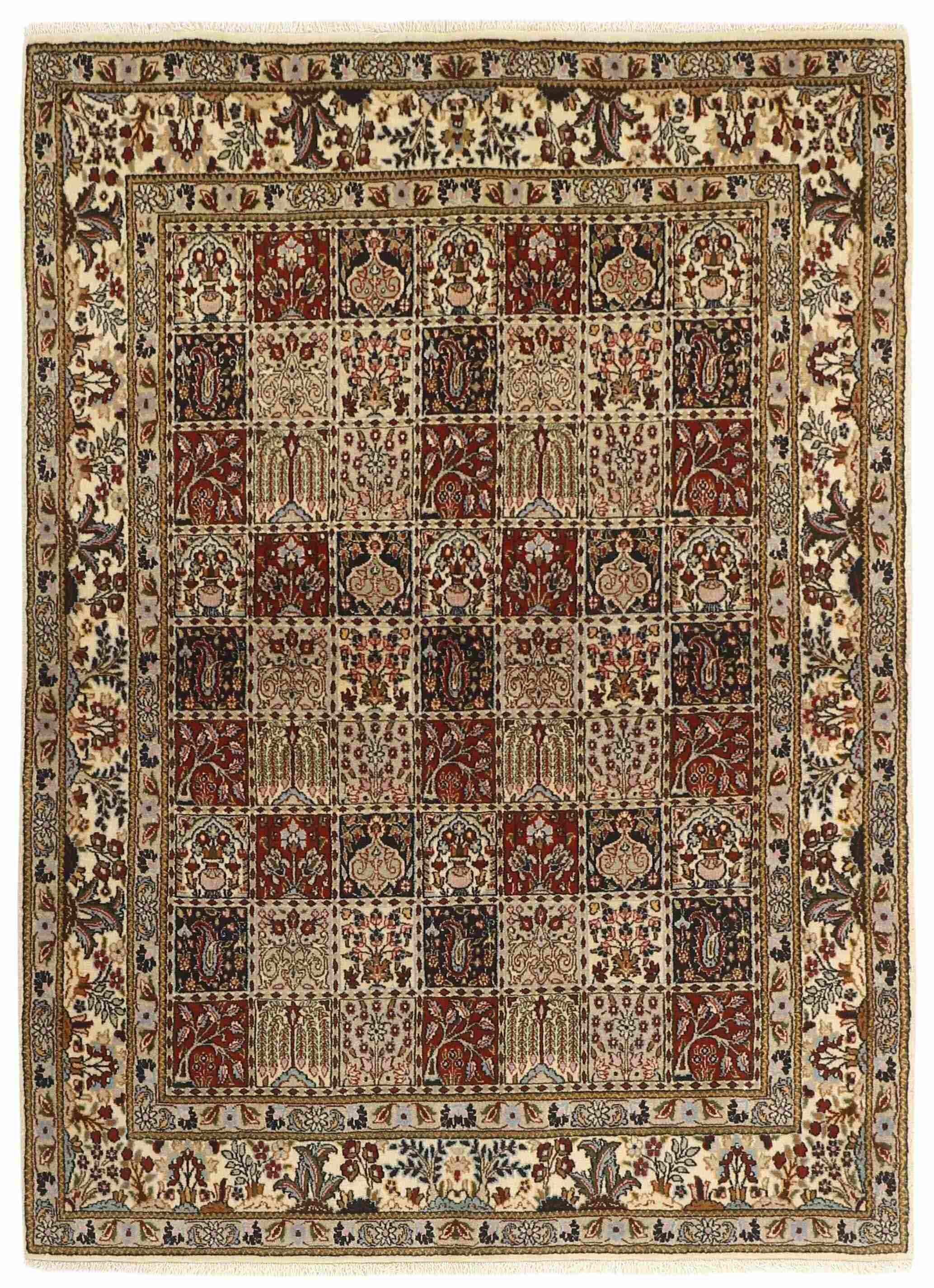 Moud est une petite ville au sud de Mashad, dans la province de Khorrasan. Les tapis de cette région se caractérisent par l'homogénéité de leurs motifs et de leur qualité. La chaîne et la trame sont en coton et le velours en laine. Les bordures sont une version de la bordure persane traditionnelle en tortue. Les tapis sont fabriqués dans toutes les tailles. Les tapis Moud sont souvent copiés en Inde, en raison de leur remarquable homogénéité. Les motifs caractéristiques de Moud sont parmi les plus uniformes, les plus réguliers et les plus facilement reconnaissables de la province de Khorrasan. Les Moud Mahi sont fabriqués dans des tons beige, rouge clair ou bleu, avec des motifs Mahi sur toute la surface ou avec un médaillon en forme d'étoile. Mahi signifie poisson et le motif Mahi est le motif le plus couramment utilisé dans les véritables tapis persans. En l'observant de près, vous pouvez voir un étang entouré de quatre poissons.