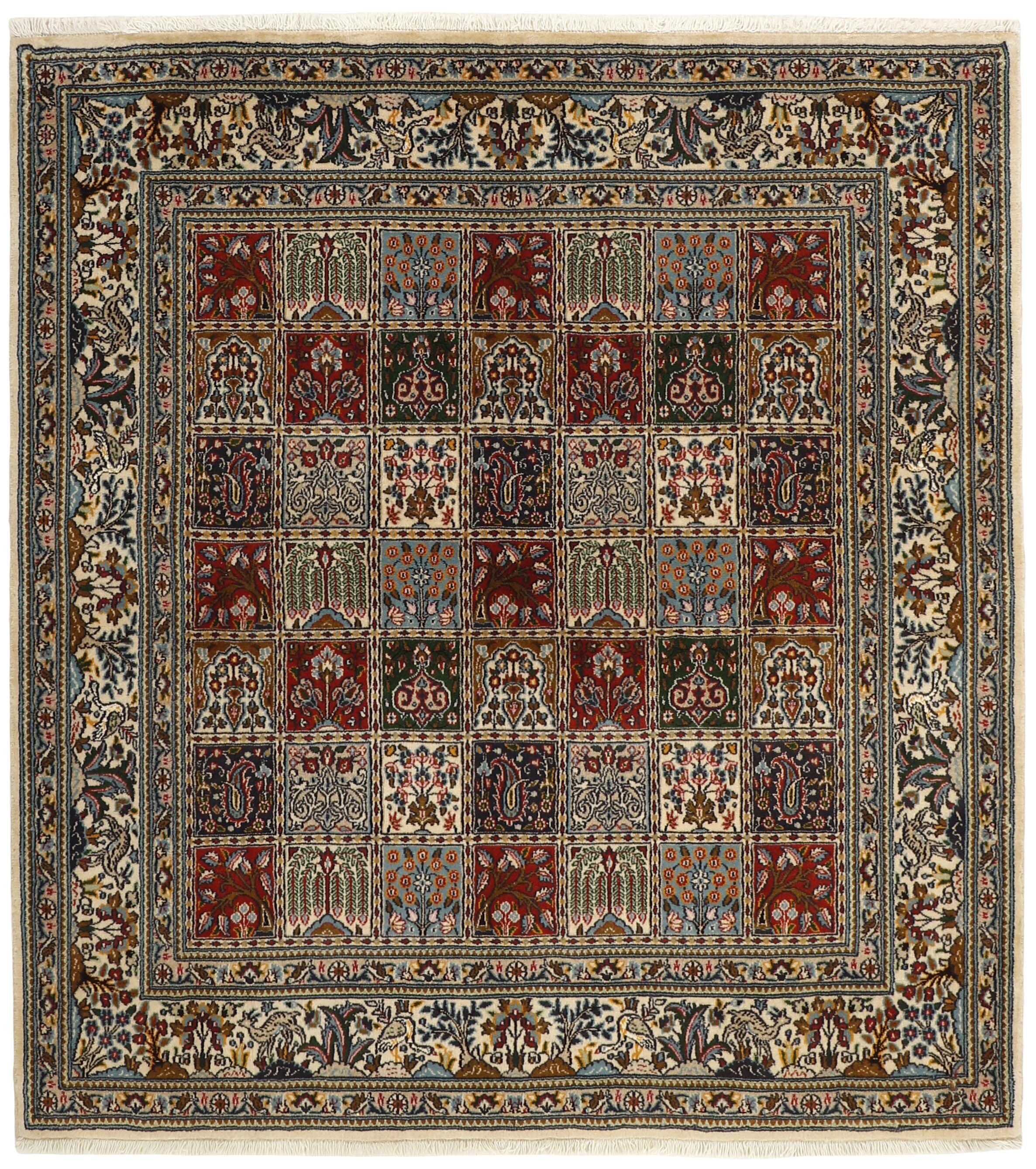 Moud est une petite ville au sud de Mashad, dans la province de Khorrasan. Les tapis de cette région se caractérisent par l'homogénéité de leurs motifs et de leur qualité. La chaîne et la trame sont en coton et le velours en laine. Les bordures sont une version de la bordure persane traditionnelle en tortue. Les tapis sont fabriqués dans toutes les tailles. Les tapis Moud sont souvent copiés en Inde, en raison de leur remarquable homogénéité. Les motifs caractéristiques de Moud sont parmi les plus uniformes, les plus réguliers et les plus facilement reconnaissables de la province de Khorrasan. Les Moud Mahi sont fabriqués dans des tons beige, rouge clair ou bleu, avec des motifs Mahi sur toute la surface ou avec un médaillon en forme d'étoile. Mahi signifie poisson et le motif Mahi est le motif le plus couramment utilisé dans les véritables tapis persans. En l'observant de près, vous pouvez voir un étang entouré de quatre poissons.