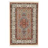 Moud est une petite ville au sud de Mashad, dans la province de Khorrasan. Les tapis de cette région se caractérisent par l'homogénéité de leurs motifs et de leur qualité. La chaîne et la trame sont en coton et le velours en laine. Les bordures sont une version de la bordure persane traditionnelle en tortue. Les tapis sont fabriqués dans toutes les tailles. Les tapis Moud sont souvent copiés en Inde, en raison de leur remarquable homogénéité. Les motifs caractéristiques de Moud sont parmi les plus uniformes, les plus réguliers et les plus facilement reconnaissables de la province de Khorrasan. Les Moud Mahi sont fabriqués dans des tons beige, rouge clair ou bleu, avec des motifs Mahi sur toute la surface ou avec un médaillon en forme d'étoile. Mahi signifie poisson et le motif Mahi est le motif le plus couramment utilisé dans les véritables tapis persans. En l'observant de près, vous pouvez voir un étang entouré de quatre poissons.