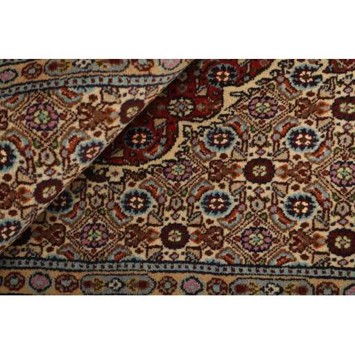 Moud est une petite ville au sud de Mashad, dans la province de Khorrasan. Les tapis de cette région se caractérisent par l'homogénéité de leurs motifs et de leur qualité. La chaîne et la trame sont en coton et le velours en laine. Les bordures sont une version de la bordure persane traditionnelle en tortue. Les tapis sont fabriqués dans toutes les tailles. Les tapis Moud sont souvent copiés en Inde, en raison de leur remarquable homogénéité. Les motifs caractéristiques de Moud sont parmi les plus uniformes, les plus réguliers et les plus facilement reconnaissables de la province de Khorrasan. Les Moud Mahi sont fabriqués dans des tons beige, rouge clair ou bleu, avec des motifs Mahi sur toute la surface ou avec un médaillon en forme d'étoile. Mahi signifie poisson et le motif Mahi est le motif le plus couramment utilisé dans les véritables tapis persans. En l'observant de près, vous pouvez voir un étang entouré de quatre poissons.