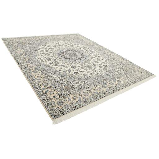 Naïn est une ville d'environ 50 000 habitants, située dans la province d'Ispahan. Elle a une importance historique, car c'était la dernière étape des routes caravanières avant Kavir-a-Lut, l'un des déserts qui s'étendent à travers le centre de l'Iran. La mosquée de Naïn est l'une des plus anciennes d'Iran et est bien mieux construite que les mosquées plus récentes et plus célèbres d'Ispahan. L'industrie de Naïn était traditionnellement axée sur la production de vêtements en laine, mais les tisserands se sont tournés vers la production de tapis lorsque la demande a chuté. Leurs nouveaux produits sont rapidement devenus célèbres, car les tisserands étaient qualifiés et utilisaient des matériaux de bonne qualité. La chaîne et la trame sont en coton, avec un velours en laine et des contours en soie. Parfois, la soie est davantage utilisée dans la base. Les couleurs sont raffinées ; des nuances d'ivoire et de crème, avec de petites zones de rouge, de vert et de bleu. Comme pour les tapis d'Ispahan, les motifs des tapis de Naïn sont également classiques. Les tapis Nain sont fabriqués dans toutes les tailles, y compris les très grands tapis allant jusqu'à 60 m², et certains d'entre eux ont un velours en soie pure. Le plus grand tapis Nain produit mesurait 20 mètres sur 20.