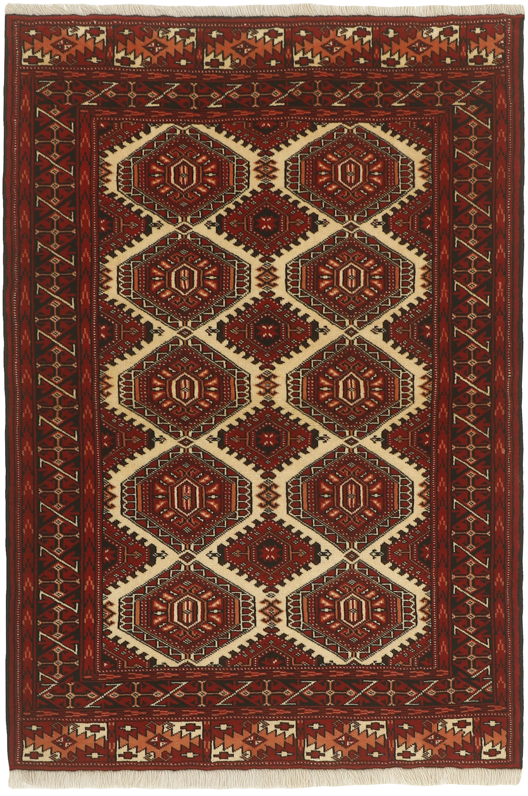 Les Turkmènes sont une tribu très importante, vivant principalement en Afghanistan et dans l'ancienne République soviétique du Turkménistan. La population iranienne est limitée à une zone autour de Gonbad-e-Kavus (500 000 habitants) dans la province de Mazandran. Les Turkmènes iraniens appartiennent à trois tribus : les Yomut, les Tekke et les Atabat. Les deux premières sont surtout célèbres pour leurs tapis. À l'origine, ils étaient des tribus nomades, mais la plupart des Turkmènes iraniens sont maintenant sédentaires, bien qu'ils aient souvent une tente ronde traditionnelle sur une place près de leurs maisons modernes en briques. Les tapis turkmènes sont traditionnellement faits de laine et ont une gamme limitée de couleurs : rouge, noir et ivoire, parfois mélangés à d'autres couleurs et à de la soie. Les motifs typiques sont des fleurs géométriques (güls) et des motifs octogonaux avec des variations selon la tribu. Selon la tradition, les tapis sont fabriqués en plusieurs tailles, selon l'endroit où ils doivent être utilisés dans la tente : comme rideaux de porte, couvre-sacs, etc. De très grands tapis sont parfois fabriqués sur commande pour les chefs de tribu.