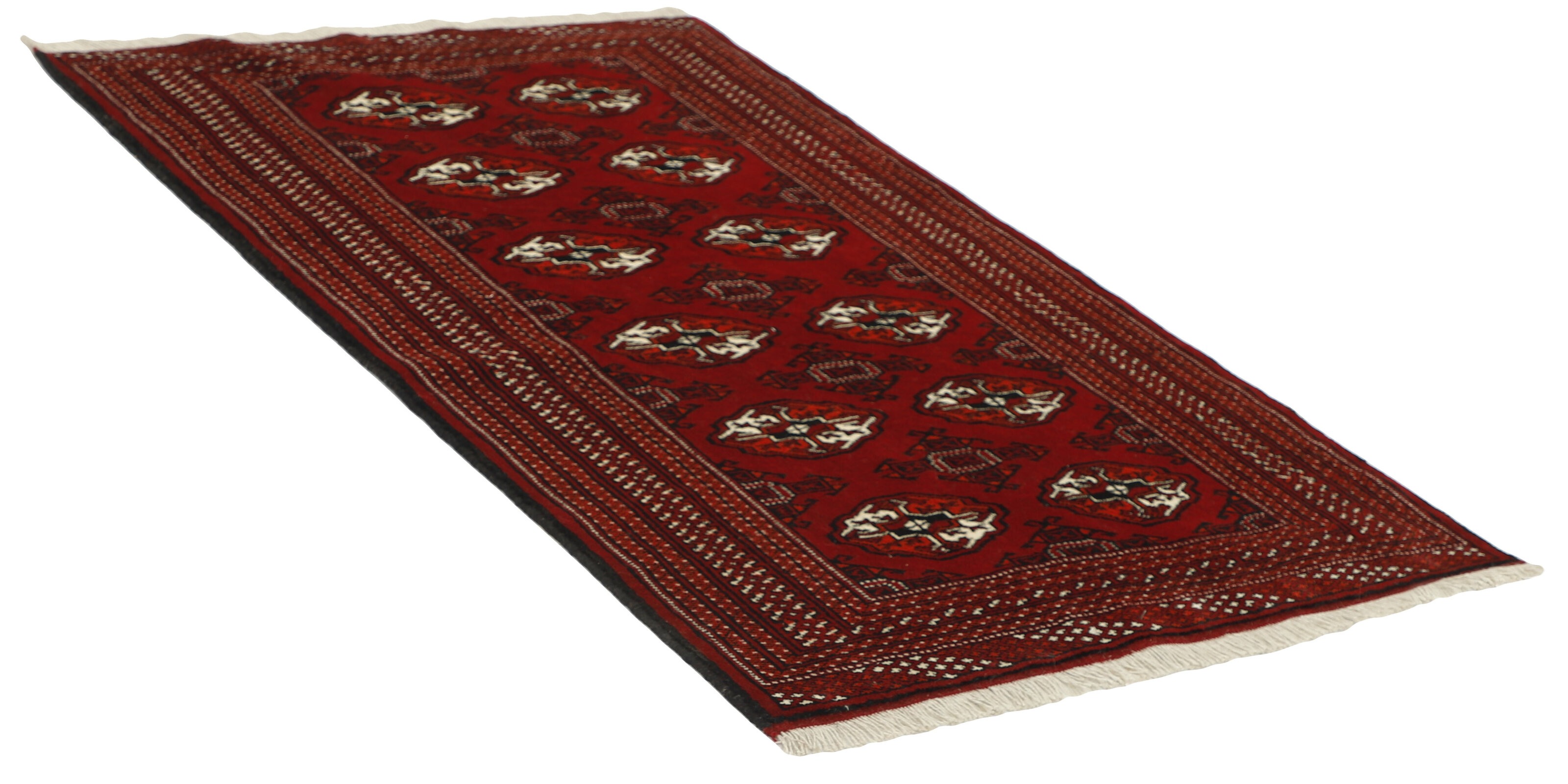 Les Turkmènes sont une tribu très importante, vivant principalement en Afghanistan et dans l'ancienne République soviétique du Turkménistan. La population iranienne est limitée à une zone autour de Gonbad-e-Kavus (500 000 habitants) dans la province de Mazandran. Les Turkmènes iraniens appartiennent à trois tribus : les Yomut, les Tekke et les Atabat. Les deux premières sont surtout célèbres pour leurs tapis. À l'origine, ils étaient des tribus nomades, mais la plupart des Turkmènes iraniens sont maintenant sédentaires, bien qu'ils aient souvent une tente ronde traditionnelle sur une place près de leurs maisons modernes en briques. Les tapis turkmènes sont traditionnellement faits de laine et ont une gamme limitée de couleurs : rouge, noir et ivoire, parfois mélangés à d'autres couleurs et à de la soie. Les motifs typiques sont des fleurs géométriques (güls) et des motifs octogonaux avec des variations selon la tribu. Selon la tradition, les tapis sont fabriqués en plusieurs tailles, selon l'endroit où ils doivent être utilisés dans la tente : comme rideaux de porte, couvre-sacs, etc. De très grands tapis sont parfois fabriqués sur commande pour les chefs de tribu.