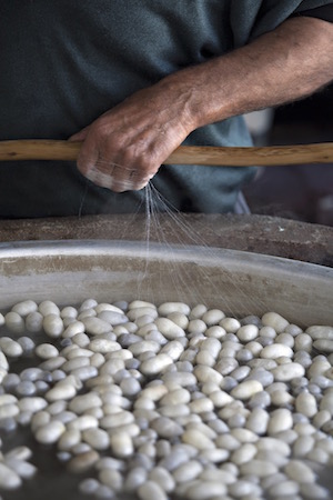 Après le séchage, démêlage du velours entre chaque rangée de nœuds dans le prolongement de files de chaînes. Ceci est réalisé à l'aide d'un outil conique à quatre faces.