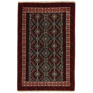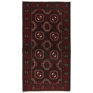 The Balouch tribes are spread across a vast area in eastern Iran and constitute a significant part of the population in Pakistan and Afghanistan. Although Baluchistan is situated partly in Pakistan and partly in the south-eastern Iranian province of Sistan, Balouch rugs are not produced in Baluchistan but in the north-eastern Khorasan province, where about 12 tribes knot rugs. The rugs are sold in Mashad, Turbat-e-Haidari, Naishapur Birjand, and Zabul. Like all nomad rugs, the Balouch rugs are small, most of them being prayer rug sized. Prayer rugs are actually very common; the arches are always geometrical, as if two rectangles had been cut off the corners of one end. Kurdish and Turkmen tribes, whose territories border the area, influence other patterns. Sometimes, the patterns also consist of birds and people. The most common colours are deep red, dark blue, and white. The rugs are usually 100% wool. The knotting is generally very fine, and often brocade Kelims are embroidered at one end.