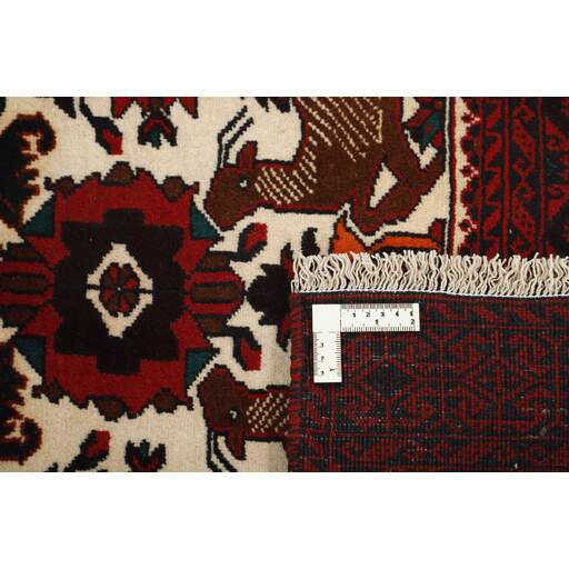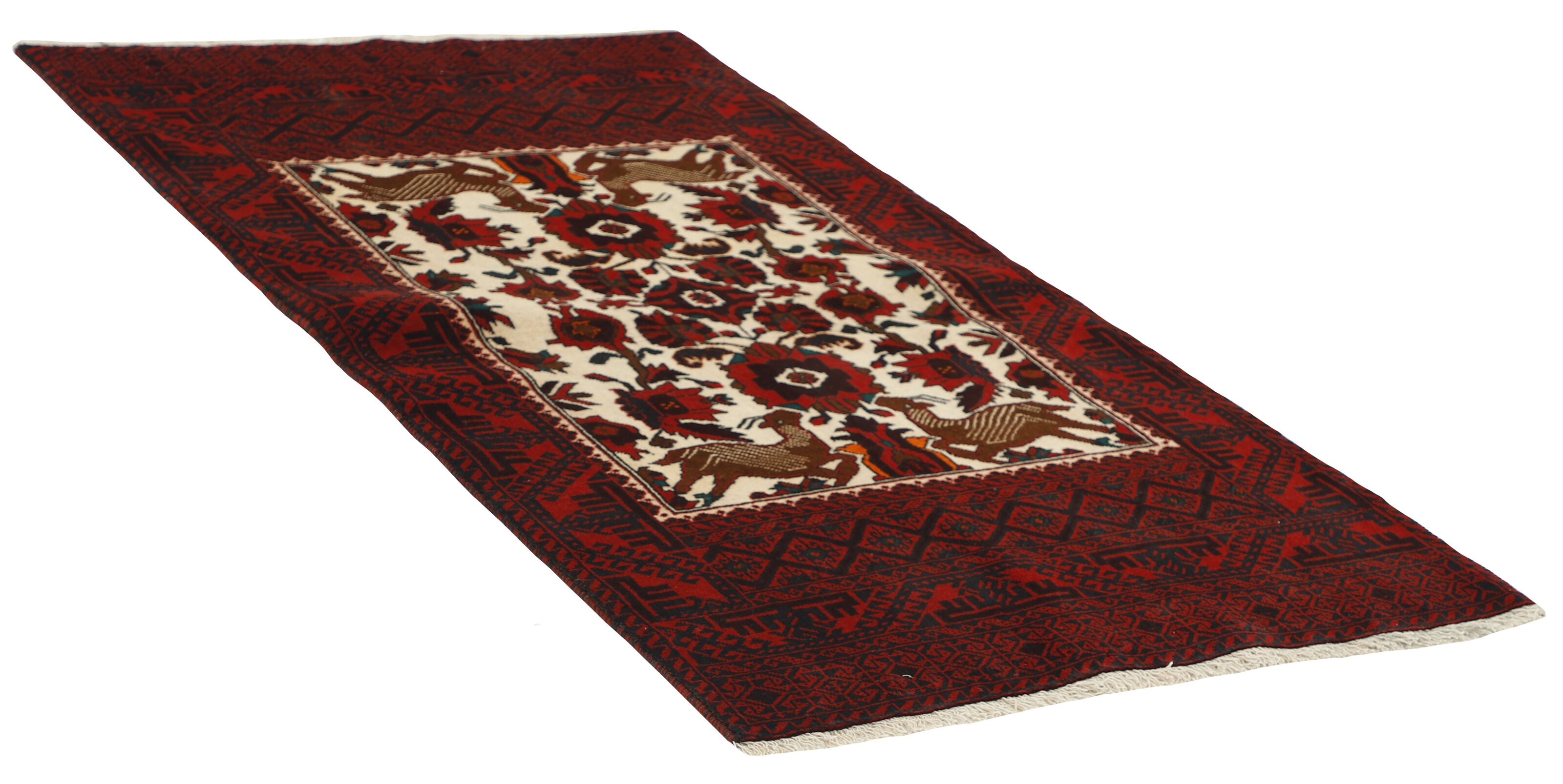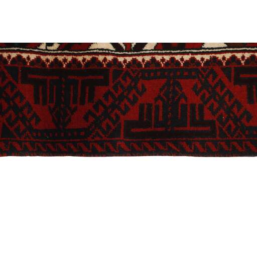 Les tribus baloutches sont réparties sur une vaste zone dans l'est de l'Iran et constituent une part importante de la population du Pakistan et de l'Afghanistan. Bien que le Baloutchistan soit situé en partie au Pakistan et en partie dans la province iranienne du Sistan au sud-est, les tapis baloutches ne sont pas fabriqués au Baloutchistan mais dans la province du Khorasan au nord-est, où une douzaine de tribus fabriquent des tapis noués. Les tapis sont vendus à Mashad, Turbat-e-Haidari, Naishapur Birjand et Zabul. Comme tous les tapis nomades, les tapis baloutches sont petits, la plupart d'entre eux ayant la taille d'un tapis de prière. Les tapis de prière sont en fait très courants ; les arcs sont toujours géométriques, comme si deux rectangles avaient été coupés aux coins d'une extrémité. Les tribus kurdes et turkmènes, dont les territoires bordent la région, influencent d'autres motifs. Parfois, les motifs se composent également d'oiseaux et de personnages. Les couleurs les plus courantes sont le rouge foncé, le bleu foncé et le blanc. Les tapis sont généralement 100 % laine. Le nouage est généralement très fin et les kilims en brocart sont souvent brodés à une extrémité.