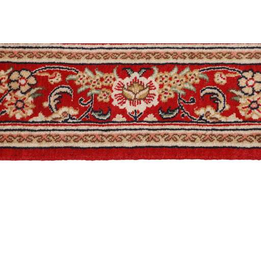 Ghom, ville d'un demi-million d'habitants, se trouve au sud de Téhéran, sur la route menant à la province de Markazi (centre). L'industrie du tapis de la ville ne s'est développée qu'après 1930, mais elle a acquis une bonne réputation. Comme il n'existe aucune tradition ou précédent sur lequel s'appuyer, les tisserands puisent leurs motifs dans différentes sources, d'où ils les transfèrent et les combinent. Certains motifs sont entièrement copiés et il n'est pas rare de voir des copies de tapis Joshqan ou Sirjan fabriquées à Ghom, mais elles sont beaucoup plus fines que les originales et réalisées avec un velours de soie. En outre, plusieurs variantes de médaillons et de motifs uniformes sont réalisées. Le velours est soit en soie avec chaîne et trame de soie, soit en laine, ou en laine mélangée à de la soie, avec une base en coton. Le nouage est généralement fin. Une large gamme de couleurs est utilisée, parfois dans des combinaisons qui semblent étranges aux Occidentaux. Un rose et un vert puissants sont particulièrement caractéristiques des tapis de soie.