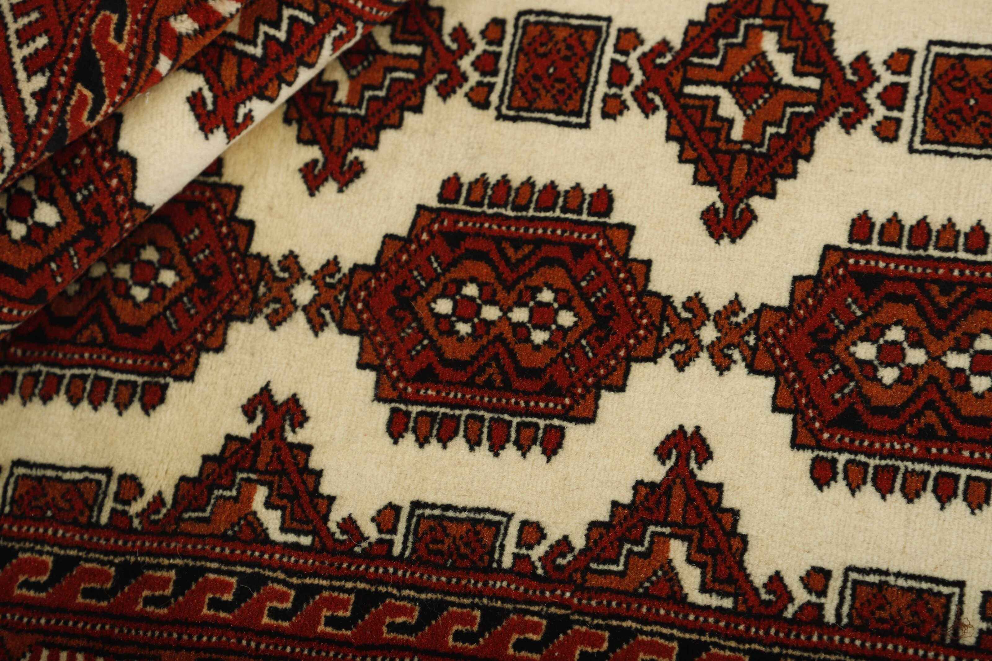 Les Turkmènes sont une tribu très importante, vivant principalement en Afghanistan et dans l'ancienne République soviétique du Turkménistan. La population iranienne est limitée à une zone autour de Gonbad-e-Kavus (500 000 habitants) dans la province de Mazandran. Les Turkmènes iraniens appartiennent à trois tribus : les Yomut, les Tekke et les Atabat. Les deux premières sont surtout célèbres pour leurs tapis. À l'origine, ils étaient des tribus nomades, mais la plupart des Turkmènes iraniens sont maintenant sédentaires, bien qu'ils aient souvent une tente ronde traditionnelle sur une place près de leurs maisons modernes en briques. Les tapis turkmènes sont traditionnellement faits de laine et ont une gamme limitée de couleurs : rouge, noir et ivoire, parfois mélangés à d'autres couleurs et à de la soie. Les motifs typiques sont des fleurs géométriques (güls) et des motifs octogonaux avec des variations selon la tribu. Selon la tradition, les tapis sont fabriqués en plusieurs tailles, selon l'endroit où ils doivent être utilisés dans la tente : comme rideaux de porte, couvre-sacs, etc. De très grands tapis sont parfois fabriqués sur commande pour les chefs de tribu.