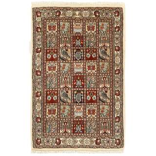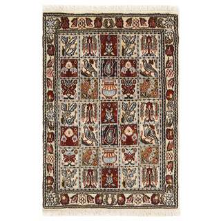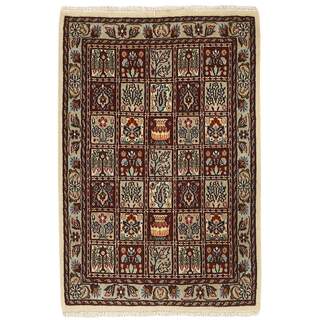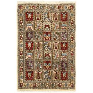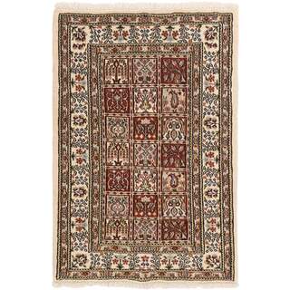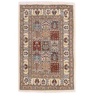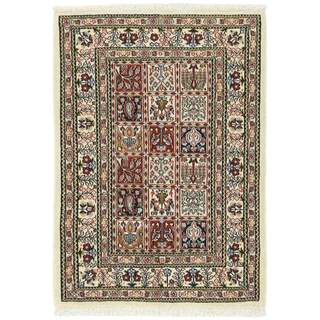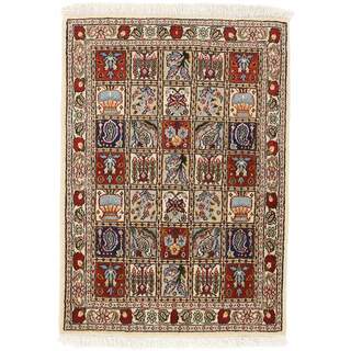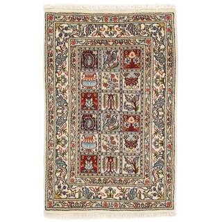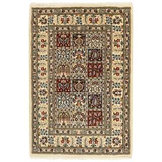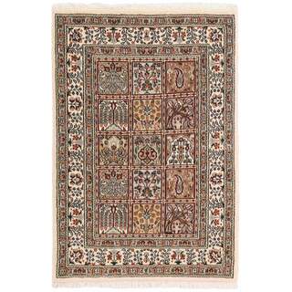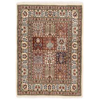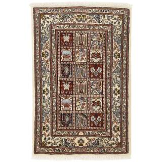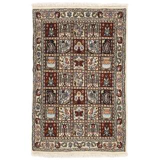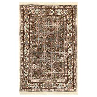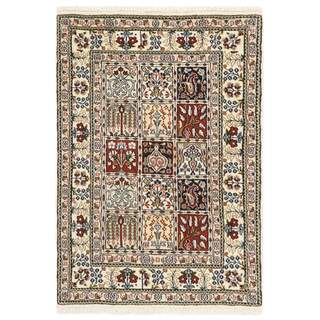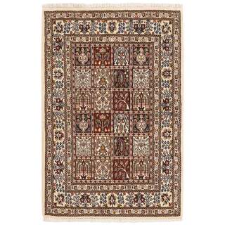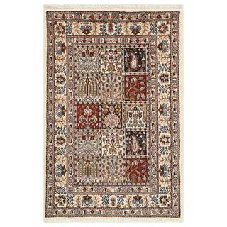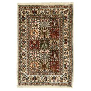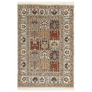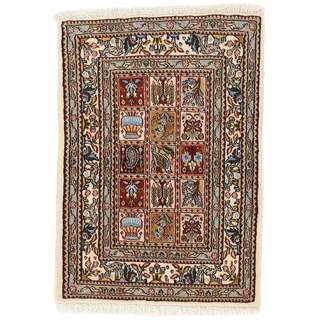 Moud is a small town south of Mashad, in the Khorrasan Province. Rugs from this area are characterised by homogeneity in patterns and quality. They always have a Mahi or Herati pattern base on a cream coloured background, sometimes with a round medallion and corners. The most common colours are ivory, blue, and brown. The warp and weft are cotton and the pile is wool. The trimmings are a version of the traditional Persian turtle trimming. The rugs are produced in all sizes. Moud rugs are often copied in India, because of their remarkable homogeneity. The characteristic Moud designs are among the most uniform, evenly knotted, and easily recognisable designs of the Khorrasan Province. The Moud Garden pattern, known from Bakhtiary designs, illustrates a stylised garden seen from above.