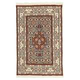 Moud est une petite ville au sud de Mashad, dans la province de Khorrasan. Les tapis de cette région se caractérisent par l'homogénéité de leurs motifs et de leur qualité. La chaîne et la trame sont en coton et le velours en laine. Les bordures sont une version de la bordure persane traditionnelle en tortue. Les tapis sont fabriqués dans toutes les tailles. Les tapis Moud sont souvent copiés en Inde, en raison de leur remarquable homogénéité. Les motifs caractéristiques de Moud sont parmi les plus uniformes, les plus réguliers et les plus facilement reconnaissables de la province de Khorrasan. Les Moud Mahi sont fabriqués dans des tons beige, rouge clair ou bleu, avec des motifs Mahi sur toute la surface ou avec un médaillon en forme d'étoile. Mahi signifie poisson et le motif Mahi est le motif le plus couramment utilisé dans les véritables tapis persans. En l'observant de près, vous pouvez voir un étang entouré de quatre poissons.