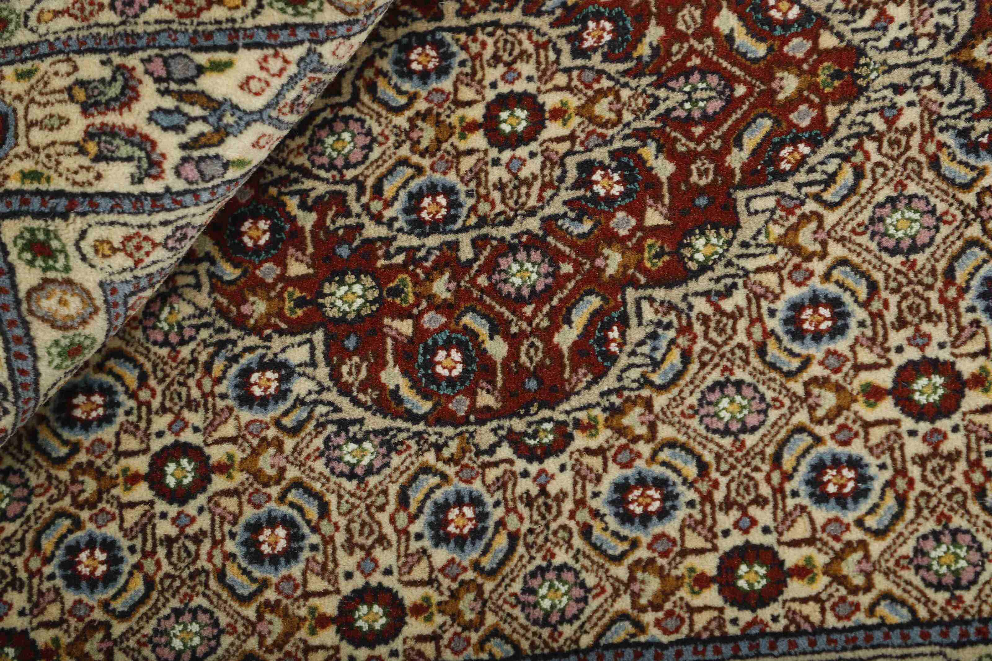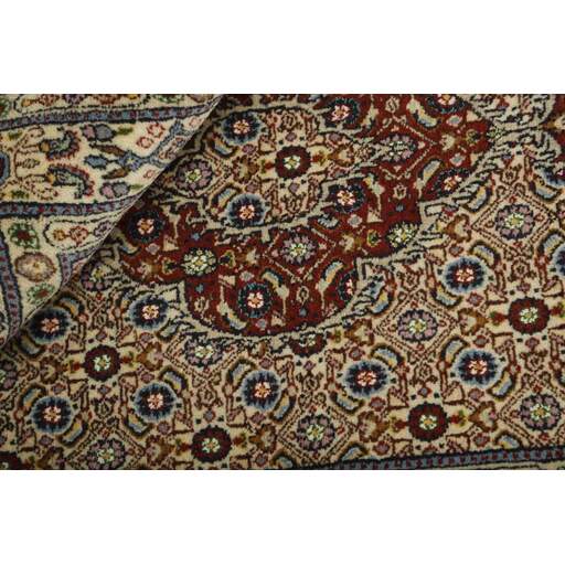 Moud est une petite ville au sud de Mashad, dans la province de Khorrasan. Les tapis de cette région se caractérisent par l'homogénéité de leurs motifs et de leur qualité. La chaîne et la trame sont en coton et le velours en laine. Les bordures sont une version de la bordure persane traditionnelle en tortue. Les tapis sont fabriqués dans toutes les tailles. Les tapis Moud sont souvent copiés en Inde, en raison de leur remarquable homogénéité. Les motifs caractéristiques de Moud sont parmi les plus uniformes, les plus réguliers et les plus facilement reconnaissables de la province de Khorrasan. Les Moud Mahi sont fabriqués dans des tons beige, rouge clair ou bleu, avec des motifs Mahi sur toute la surface ou avec un médaillon en forme d'étoile. Mahi signifie poisson et le motif Mahi est le motif le plus couramment utilisé dans les véritables tapis persans. En l'observant de près, vous pouvez voir un étang entouré de quatre poissons.