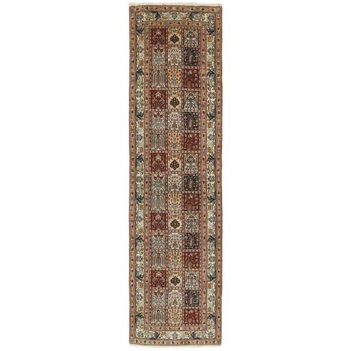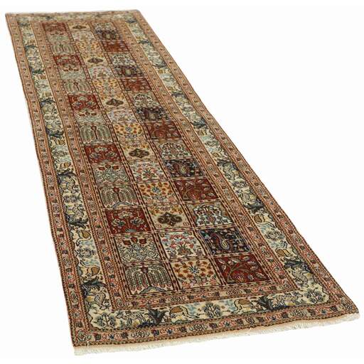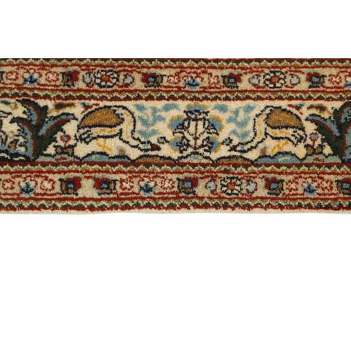 Moud est une petite ville au sud de Mashad, dans la province de Khorrasan. Les tapis de cette région se caractérisent par l'homogénéité de leurs motifs et de leur qualité. La chaîne et la trame sont en coton et le velours en laine. Les bordures sont une version de la bordure persane traditionnelle en tortue. Les tapis sont fabriqués dans toutes les tailles. Les tapis Moud sont souvent copiés en Inde, en raison de leur remarquable homogénéité. Les motifs caractéristiques de Moud sont parmi les plus uniformes, les plus réguliers et les plus facilement reconnaissables de la province de Khorrasan. Les Moud Mahi sont fabriqués dans des tons beige, rouge clair ou bleu, avec des motifs Mahi sur toute la surface ou avec un médaillon en forme d'étoile. Mahi signifie poisson et le motif Mahi est le motif le plus couramment utilisé dans les véritables tapis persans. En l'observant de près, vous pouvez voir un étang entouré de quatre poissons.