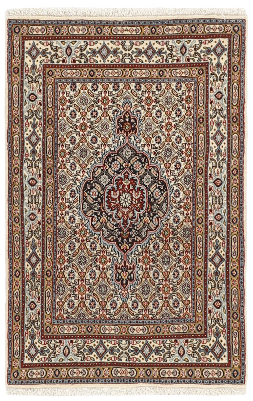 Moud is een klein stadje ten zuiden van Mashad, in de provincie Khorrasan. Tapijten uit dit gebied worden gekenmerkt door homogeniteit in patronen en kwaliteit. De schering en inslag zijn van katoen en de pool is van wol. De versieringen zijn een versie van de traditionele Perzische schildpadversiering. De tapijten worden in alle maten geproduceerd. Moud-tapijten worden vaak gekopieerd in India, vanwege hun opmerkelijke homogeniteit. De karakteristieke Moud-ontwerpen behoren tot de meest uniforme, gelijkmatig geknoopte en gemakkelijk herkenbare ontwerpen van de provincie Khorrasan. Moud Mahi worden gemaakt in een beige, lichtrode of blauwe tint, met all-over Mahi-patronen of met een stervormig medaillon. Mahi betekent vis en het Mahi-patroon is het meest gebruikte patroon in echte Perzische tapijten. Als je er goed naar kijkt, zie je een vijver omringd door vier vissen.