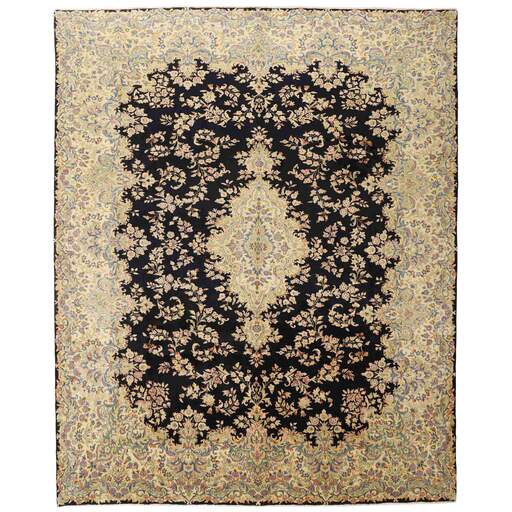 De stad Kerman ligt in het zuidoosten van Iran, aan de rand van de Kavir-e-Lut woestijn, en is de hoofdstad van de provincie Kerman, die ongeveer een half miljoen inwoners heeft. De geografische isolatie heeft gezorgd voor het behoud van veel monumenten - er zouden 90 moskeeën zijn - en een 15e-eeuws mausoleum in het nabijgelegen Mahan zou het mooiste gebouw in Iran zijn. Net als Yazd in het noordwesten, heeft Kerman een grote populatie Zoroastriërs, die de oude Iraanse religie aanhangen, die op andere plaatsen is vervangen door de islam. Het silhouet van Kerman wordt gekenmerkt door zijn windtorens - schoorsteenachtige constructies die werden gebruikt om elke windvlaag op te vangen en deze naar de binnenkant van het huis te leiden. Kerman heeft een oude textieltraditie en in grote delen van de 19e eeuw werden sjaals geweven. Toen de vraag naar sjaals daalde, veranderden de wevers hun weefgetouwen voor de productie van tapijten. Aanvankelijk gebruikten ze dezelfde patronen die ze in de omslagdoeken hadden gebruikt, maar ze pasten ze aan naarmate de mode veranderde, hoewel de Kerman-tapijten hun delicate kleuren en patronen behielden. Alle maten worden gemaakt. De grootste tapijten hebben unieke kleuren en patronen en worden vaak geknoopt in de noordelijke steden Lavar of Ravar. Afgezien van de omslagdoekpatronen heeft Kerman vaak aanpassingen van het Boteh-motief met natuurlijke boeketten bloemen, of aanpassingen van klassieke tapijtpatronen. Er wordt een breed scala aan delicate kleuren gebruikt. De pool is normaal gesproken zacht, fluweelachtig wol, terwijl schering en inslag altijd van katoen zijn.